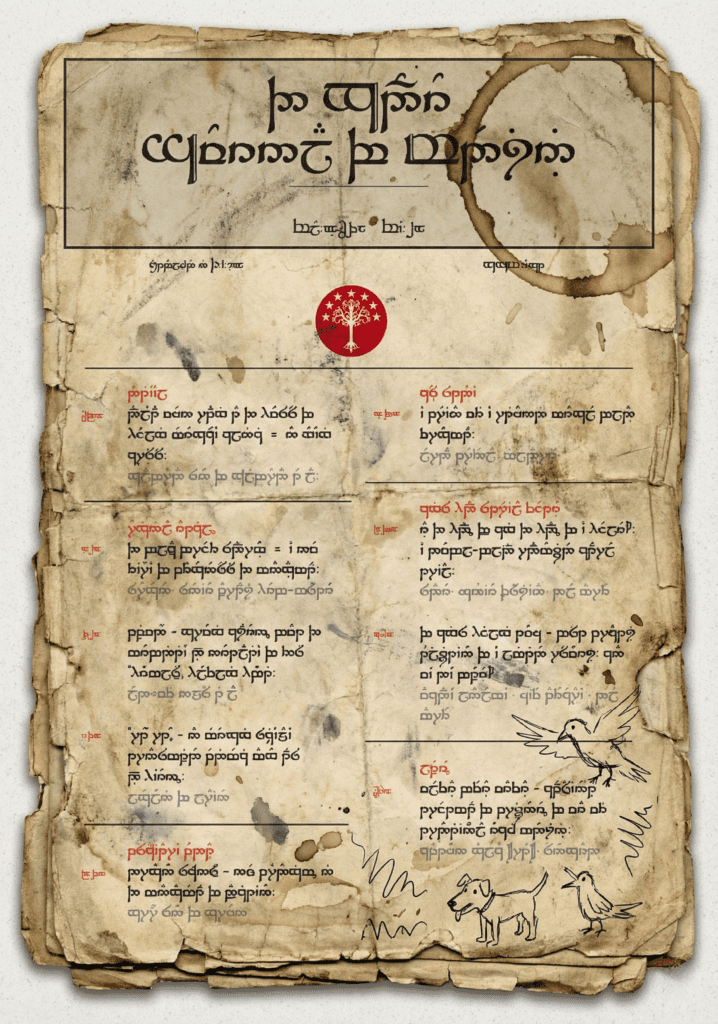 I found this remarkable document in Bundle o’ Books. It was hidden in a pile of old Mad magazines, but one corner was sticking out and the unmistakable Tengwar caught my eye. This lovely second-hand bookshop is located in Coolangatta, on the southern end of the Gold Coast in Queensland, Australia. I don’t know how