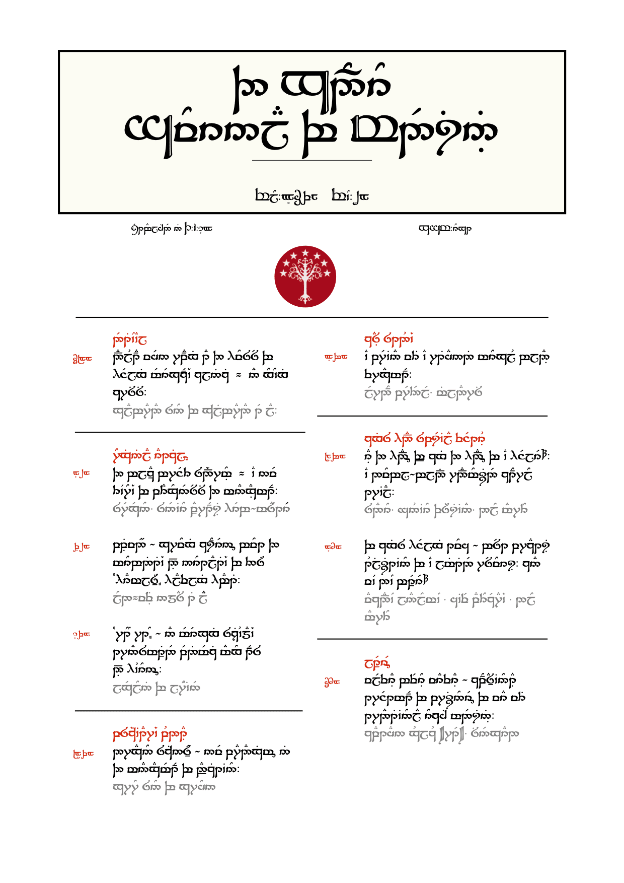 Here’s my best attempt at restoring the title page of the GJoM to its original appearance, and then again into English. The numerals in the columns to the left of the articles are page numbers in a base twelve system. The duodecimal mode was devised by the elves, and seemingly preferred by the editors of